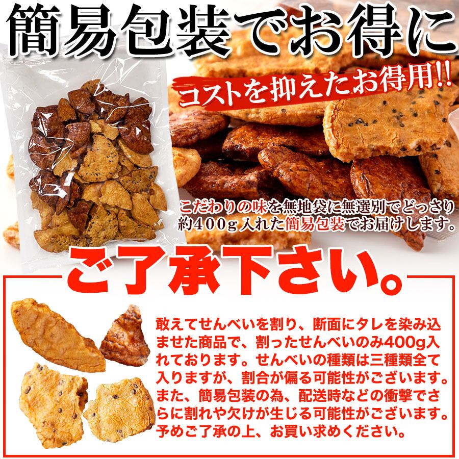 敢えてせんべいを割り、断面にタレを染み込ませた商品で、割ったせんべいのみ400g入れております。せんべいの種類は三種類全て入りますが、割合が偏る可能性がございます。